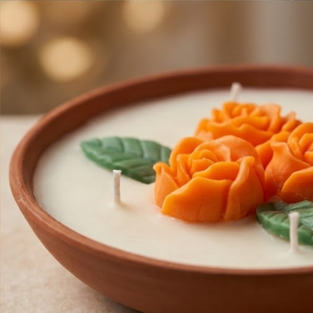 Celebrate the festival of lights with a touch of tradition and artistry. Our Genda Terracotta Candle is more than just a candle – it’s a centerpiece that brings heritage, warmth, and beauty together. Hand-poured with care into a rustic terracotta base, this candle is adorned with vibrant marigold (genda) blooms, the timeless symbol of prosperity and festivity.