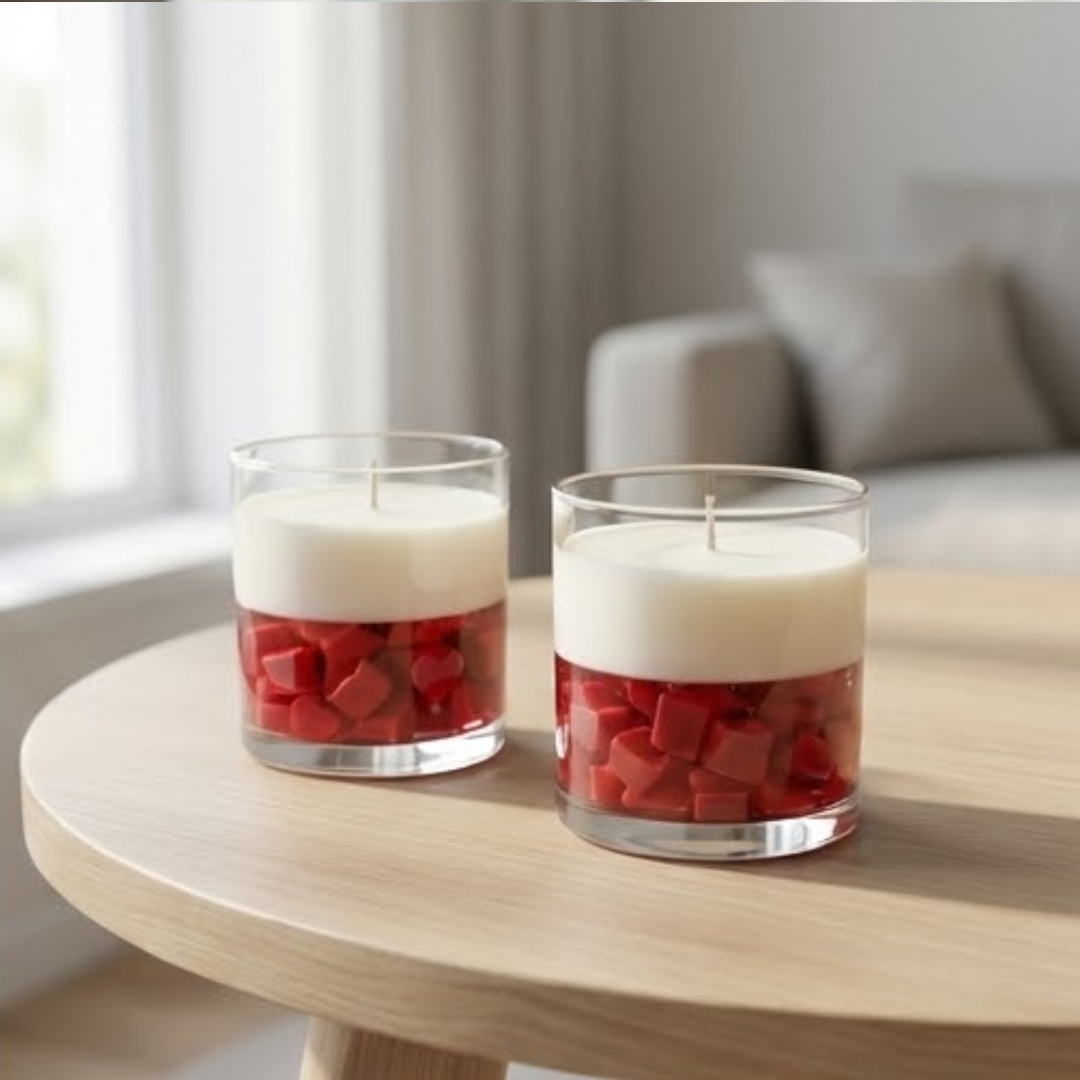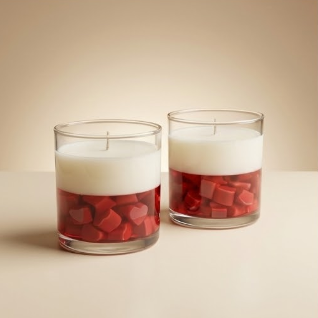 Layers of Love is a modern expression of emotion — soft, intentional, and beautifully balanced. Designed with translucent red wax layers embedded with delicate heart details and finished with a smooth ivory top, this candle tells a story of love built gently, layer by layer.