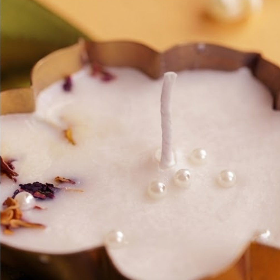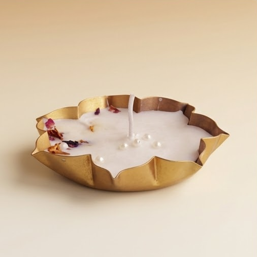 Our Lotus Urli Candle Mini is a symbol of purity, prosperity, and peace — beautifully handcrafted in a lotus-shaped base. The smooth wax surface is decorated with delicate dried petals and pearl embellishments, giving it a graceful and festive charm.