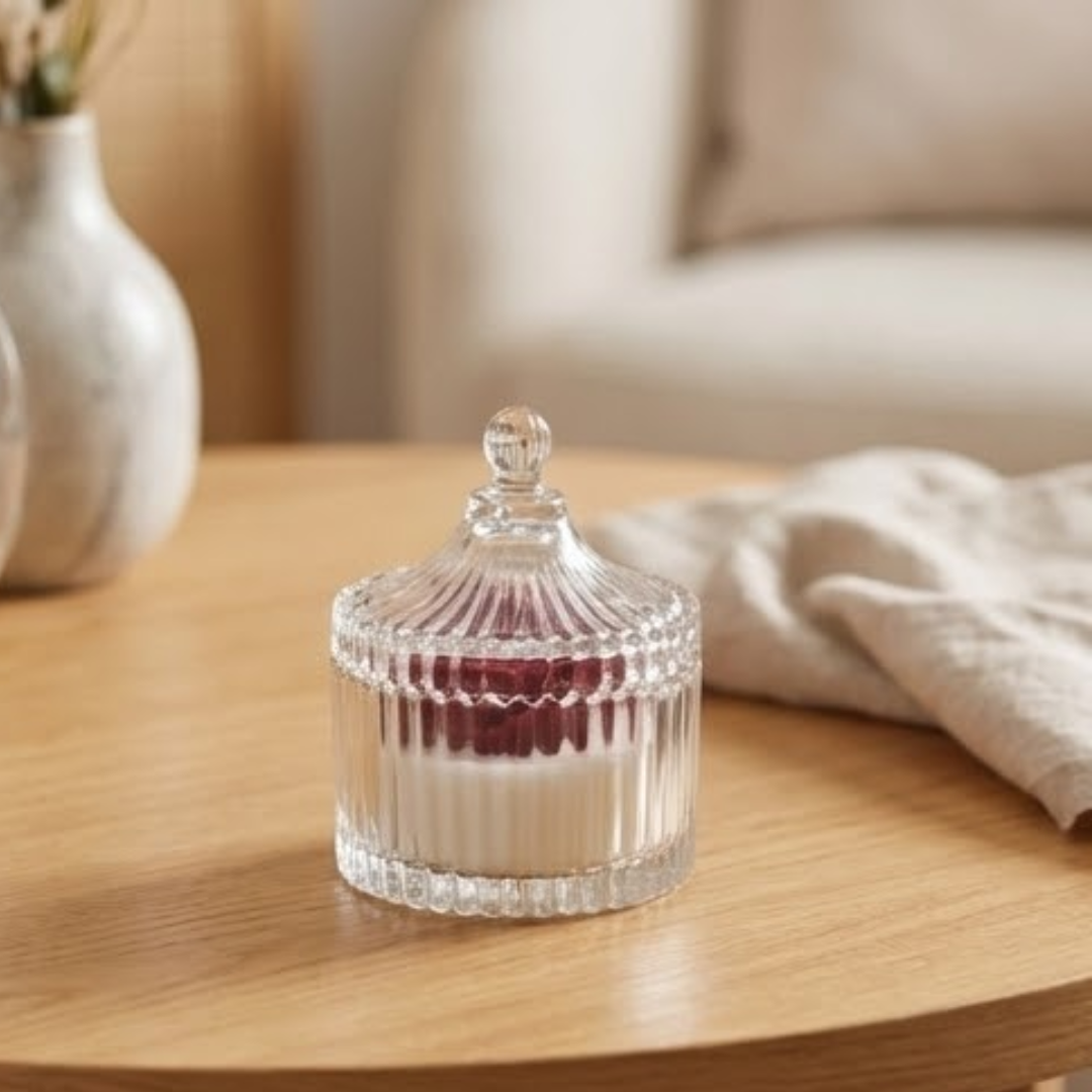 Encased in a premium ribbed crystal jar with a matching lid, this candle makes for a stunning décor piece and an intimate gift. Its soft floral aroma fills your space with a gentle, romantic aura — calm, graceful, and unforgettable.